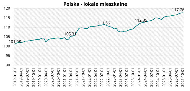 Wartość indeksu urban.one odnoszącego się do lokali mieszkalnych w Polsce w październiku br. wyniosła 117,76 pkt., co oznacza wzrost o 0,24 pkt w ciągu miesiąca.